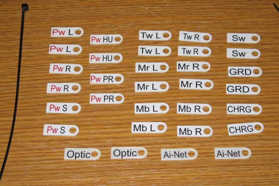 Во многом выбор конкретного метода зависит от материала изготовления кабельной бирки. Также можно купить маркеры с уже заготовленными обозначениями, реализуемые в лентах. На них есть надрезы, которые позволяют быстро и безошибочно отсоединить нужную этикетку и зафиксировать на проводе при помощи клеевой поверхности.