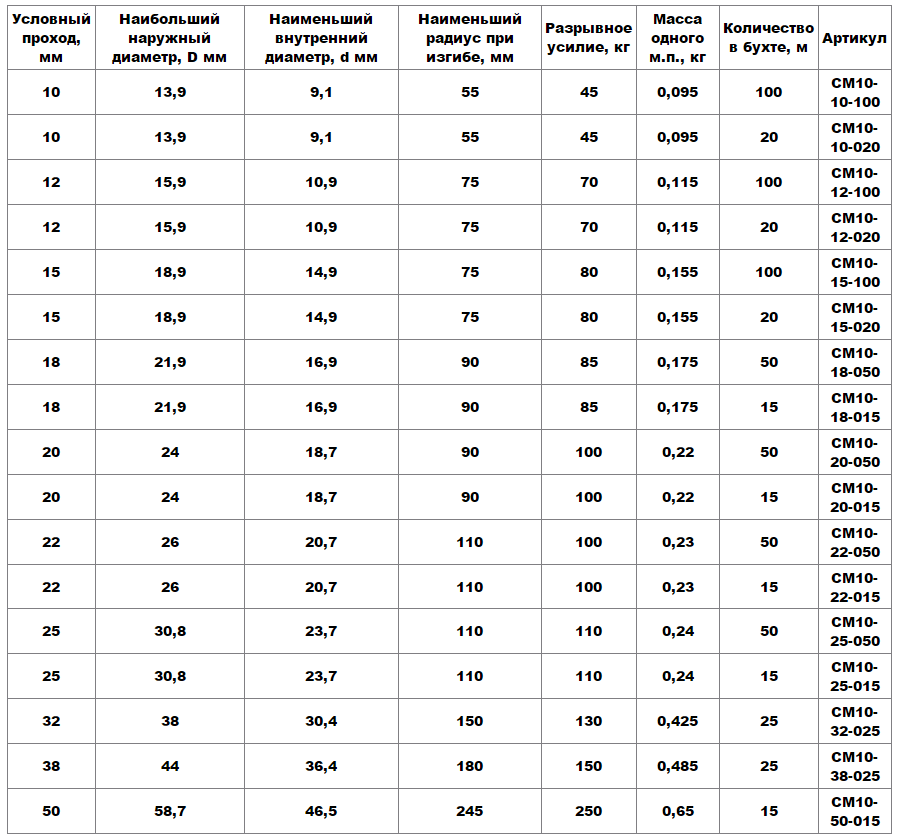 Внутренний диаметр трубы всегда меньше внешнего, а его точный размер зависит от габаритов и типа проводки. Если известен показатель наружной оболочки кабеля, то ее умножают на два. При прокладке сразу двух проводов необходимо сложить их диаметры, учитывая условный проход гофры — минимальный размер профиля витков, который нужно вычислить для покупки вводных и соединительных муфт.