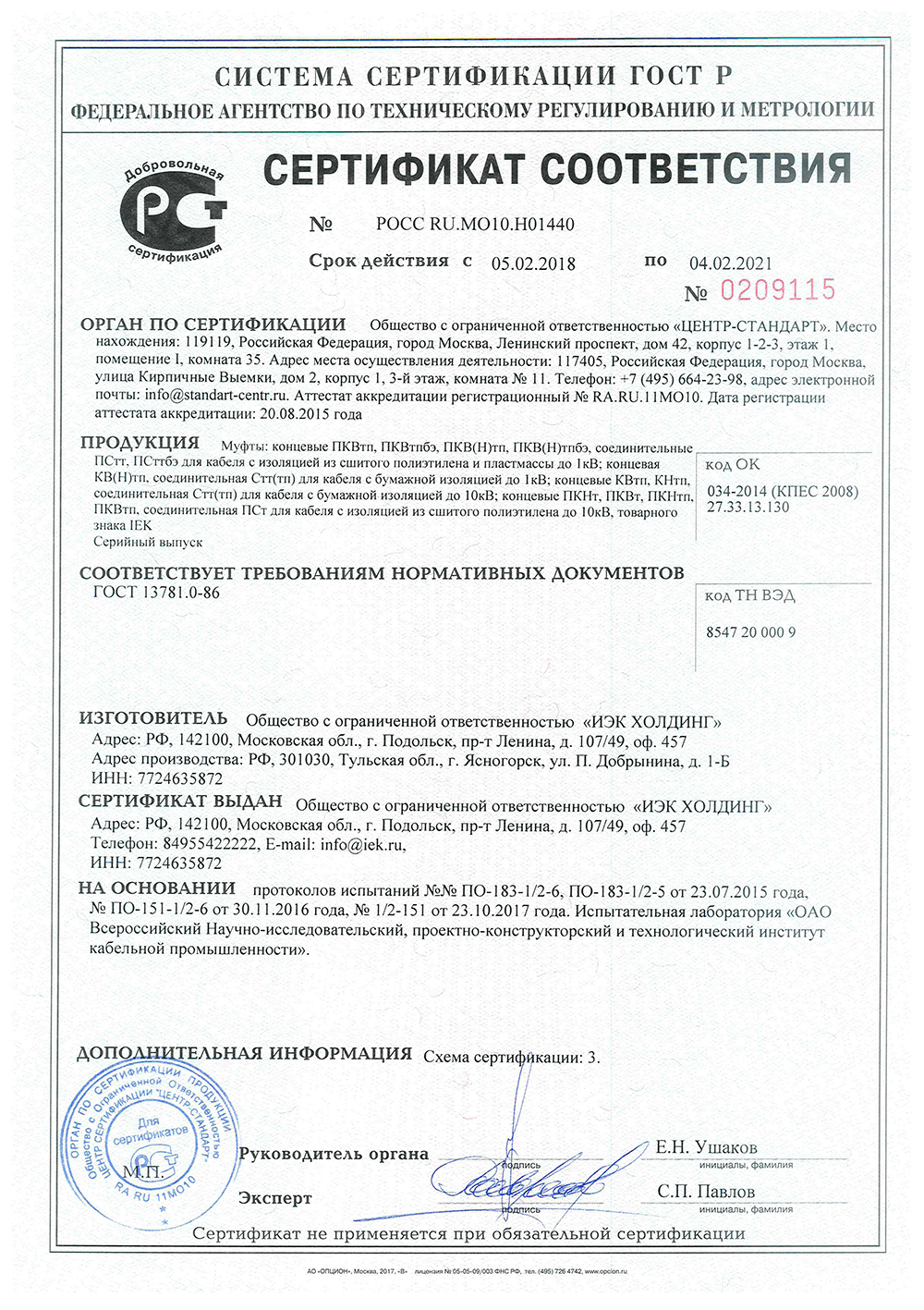 Рис. 5. Сертификат соответствия на кабельные муфты IEK
