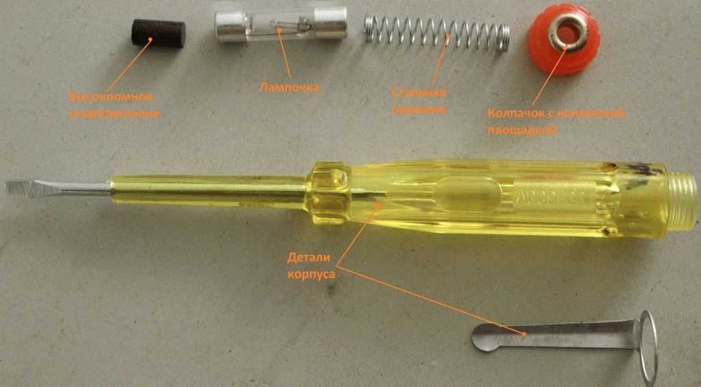 Контрольный прибор можно создать собственными руками по аналогии с индикаторной отверткой. Вместо лампочки устанавливают AL 307 или другой светодиод с подобными характеристиками. Последовательно в цепь добавляют резистор 100-120 кОм мощностью1-2 Вт.