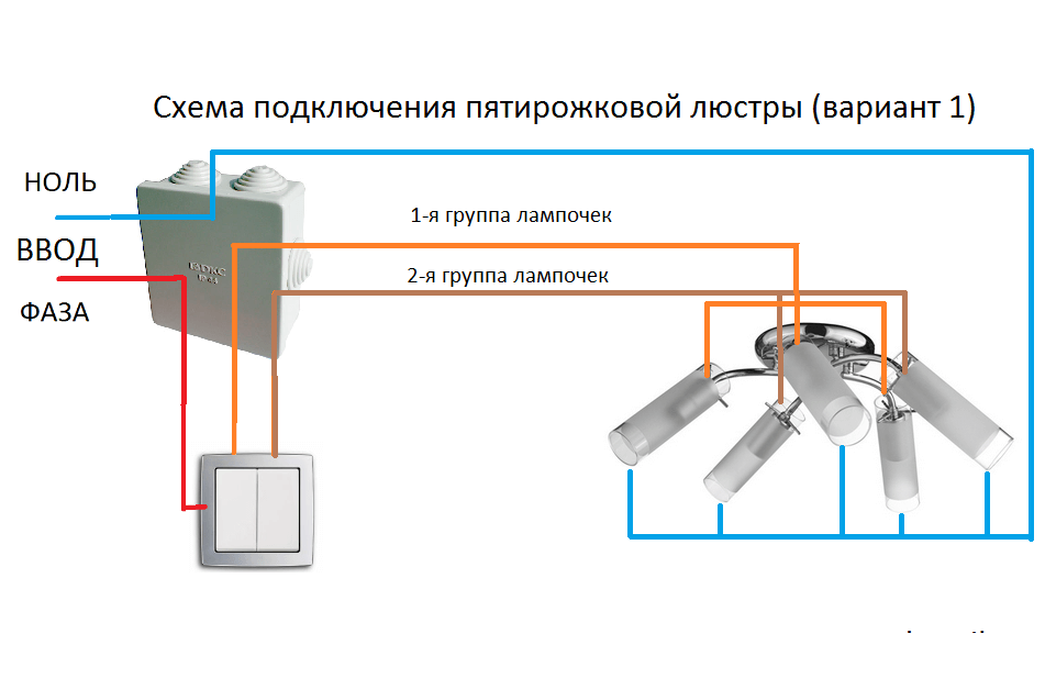 Подключение пятирожковой люстры к двойному (двухклавишному) выключателю