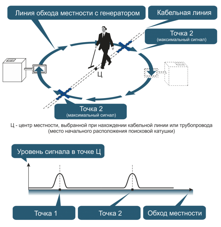 Данное исследование основано на измерении разности потенциалов. При помощи генератора сквозь проводник пропускается ток, в месте разрыва он создает соответствующую разницу. Для нахождения конкретной точки два измерительных штыря устанавливают перпендикулярно друг другу: один ровно над проводником, а второй через метр от него.