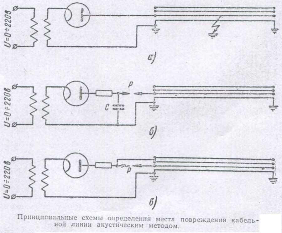 Акустический метод предусматривает использование приемника и электрогенератора мощных ударных импульсов. Конденсатор генератора присоединяют к кабелю, и когда разрядник срабатывает, напряжение в линии создаёт электромагнитную волну, происходит сильнейшее пробивание, сопровождающееся щелчком в области неисправности. Оператор улавливает щелчки при помощи акустического прибора.