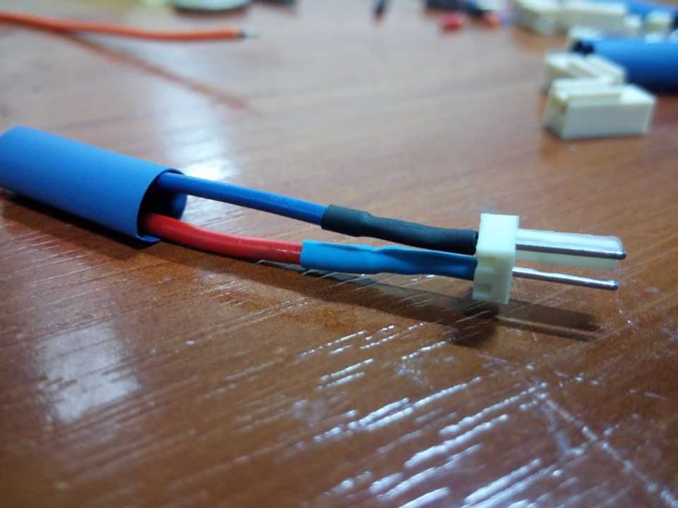 - Трубка надевается на провод и смещается в сторону от места соединения проводов. Их нужно предварительно скрутить между собой, затем можно устанавливать трубочку так, чтобы стык проводков находился в середине ее длины.