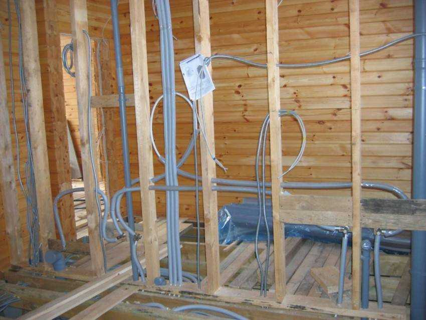 Трубы монтируются на начальных этапах строительства. Вам гарантированно понадобится физическая помощь. Подобный вариант проводки в каркасном доме требует много времени и серьезных капиталовложений, поэтому является крайне нерациональным.