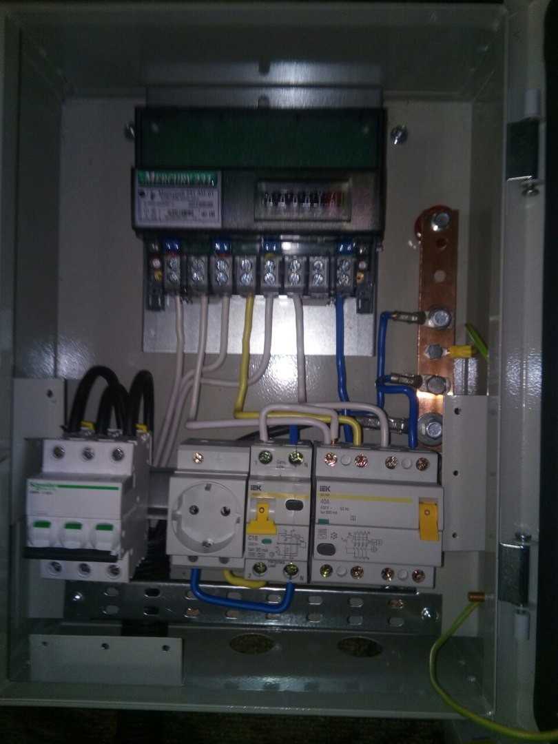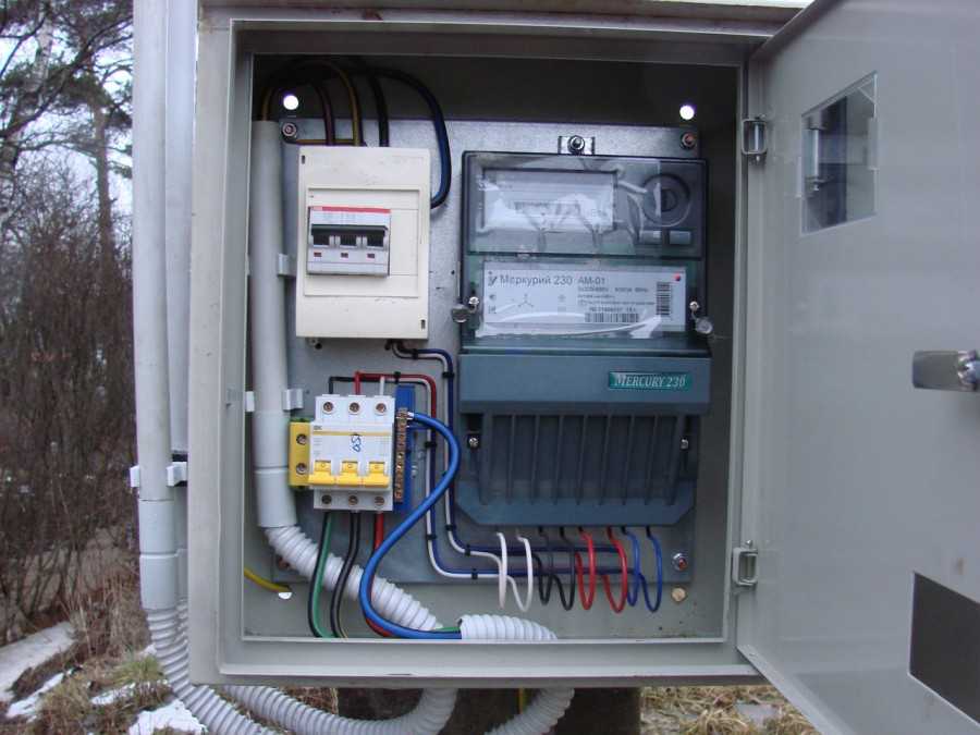 Кстати, пломбировка является платной, может сопровождаться различными бюрократическими проволочками. Для упрощения рядом с прибором учета ставится распределительная коробка IP55, в которую заводится проводка. Иногда допускается установка распределительного узла непосредственно со счетчиков. В этом случае удобно будет сделать несколько вводов. Например, один — в дом, второй — для уличного освещения, третий — для гаража или летней кухни.