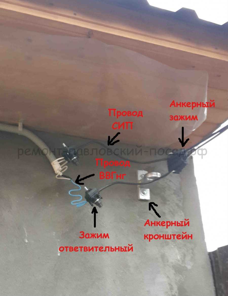 Обустройство ответвления от магистральной линии выполняется с применением прокалывающих зажимов. Число зажимов определяется количеством жил провода. На наружной стене монтаж ввода электричества в дом осуществляется при помощи анкерного зажима с кронштейном. Чтобы кабель не соприкасался с древесиной, его прокладывают в гофротрубе или пластиковом коробе.