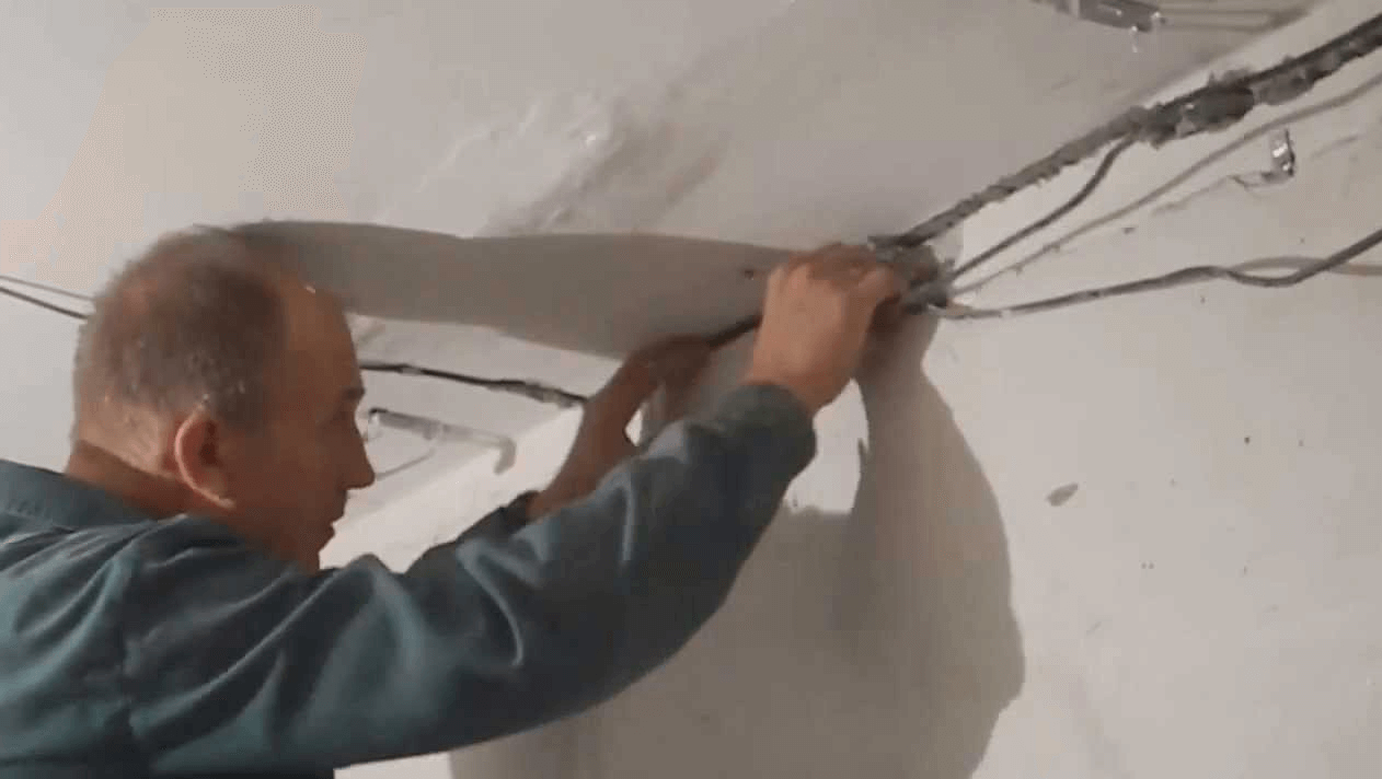 Альтернативный вариант — провести электропроводку по потолку и сделать штробы только в местах спуска к розеткам и выключателям. Спрятать прикрепленный сверху кабель можно, сделав натяжной или подвесной потолок.