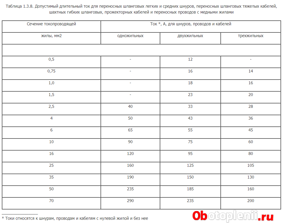 Таблица сечения медных проводов по длительно допустимому току (ПУЭ таблица 1.3.4)