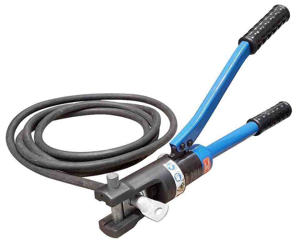 Ещё один способ соединения проводов — это опрессование. Это способ, при котором на соединяемые провода или кабели одевается медная или алюминиевая гильза, после чего опрессовывается специальным опрессователем. Для тонких гильз используют ручной опрессователь, а для толстых гидравлический. Этим способом можно даже соединять медные и алюминиевые провода, что недопустимо при болтовом соединении.