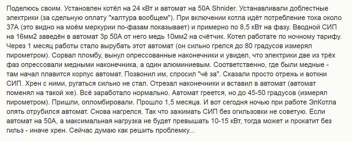 Еще один минус — если у вас вдруг СИП оказался сечением не 16мм2, а 35 или все 50мм2 (другого просто не было в наличии), то в модульные автоматы до 40А он попросту не влезет. Большинство из них, как правило рассчитаны на сечение вводных проводников максимум до 25мм2.