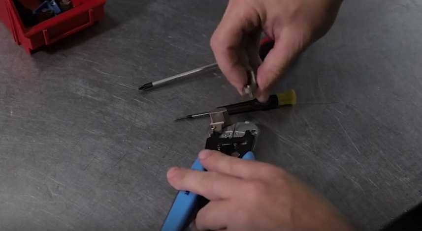Для обжимки применяются крипперы. В идеальном варианте в одном приспособлении совмещаются оба. Губки с лезвием данного инструмента аккуратно подрезают изоляцию, давая возможность снять её с кабеля. Кроме того, имеются специальные отверстия для коннекторов различных типов, которые позволяют произвести качественную обжимку. Поэтому монтер, который наизусть знает, как правильно расположить жилы кабеля в коннекторе, с помощью такого инструмента работу ведёт в разы быстрее и качественнее.