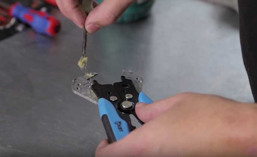 Если у вас нет под рукой кримпера, который используется для опрессовки проводов гильзами, можно выполнить обжим стриппером. Работать инструментом в этом случае достаточно просто. Сначала снимаете изоляцию на нужную длину, после этого устанавливаете наконечник на жилу и заводите в подходящий разъем на рукоятке. Сжимаете ручки и в итоге у вас должен получится обжатый наконечник. Последний этап — отрезаете лишнюю часть жилы на конце, если это необходимо.