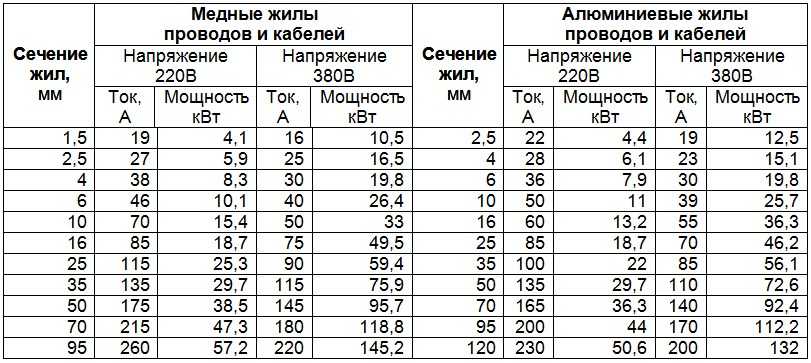 | Сечение проводника, мм кв. | Ток (А)/ Суммарная мощность потребителей (кВт) для сетей | |
