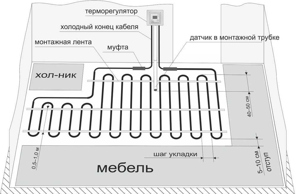 Примерная схема укладки двухжильного нагревательного кабеля в жилой комнате