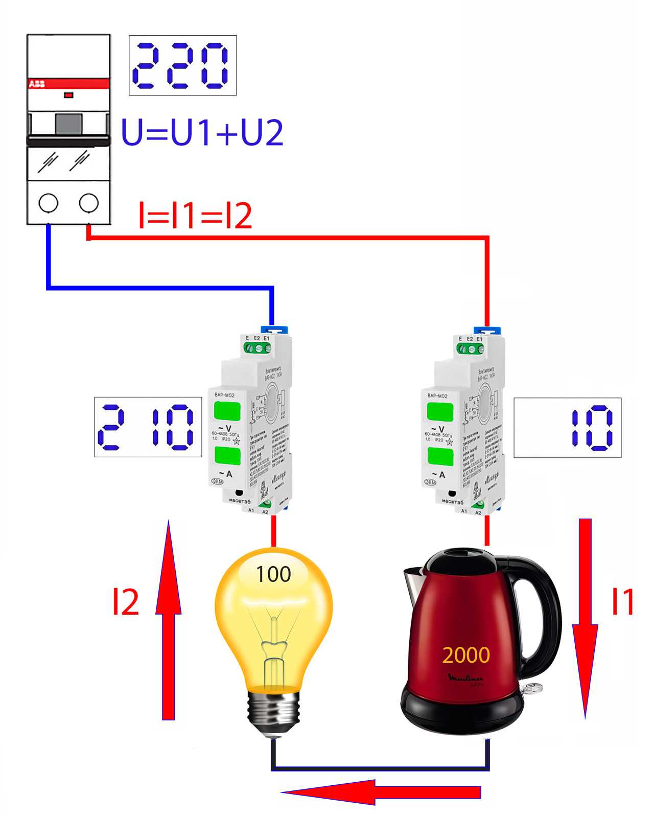 Если взять еще более мощный прибор, например 2-х киловаттный чайник или фен, то разница в напряжении будет еще существеннее. Почти все оно будет отдаваться менее мощной лампе, чайник же при этом даже не запустится.