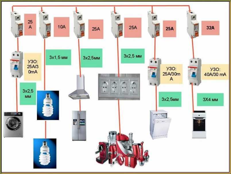 Мощное оборудование подключают к трехфазному выходу. Одной фазы и нуля для электрической плиты и духовки маловато. Дополнительный провод пробрасывают от коридорного щитка. Суммарная мощность всей техники колеблется в районе 15 кВт, сечение выбирают с учетом такой нагрузки.