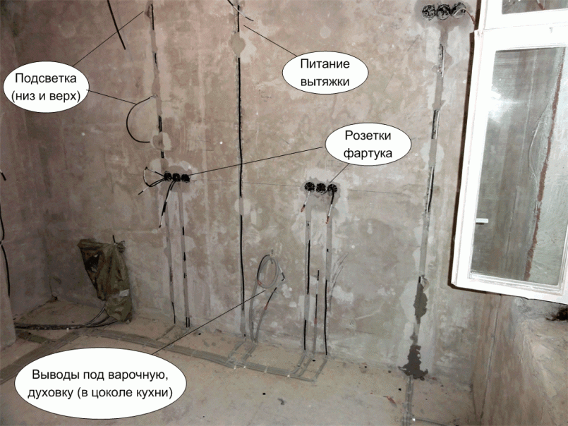 На кухне есть зоны особой опасности: плита и раковина. В этих местах провод подвергается нагреву и воздействию влаги. Если обойти источники повышенной опасности не удается, провод укладывают в гофротрубы.
