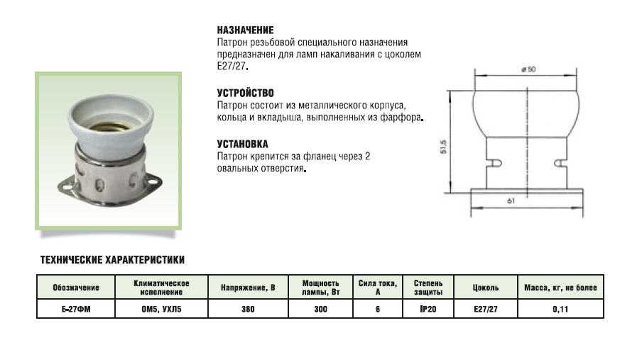 Электрический патрон с проводом создан, чтобы обеспечивать механическую прочность соединения и надежный контакт. Обычно, имеют резьбу с диаметром от 5 до 40 миллиметров, максимально допустимую температуру работы в 180 градусов и корпус из пластмассы, металла или керамики. Рассчитаны на работу с источниками до и от 100 ватт. Соответствуют нормативной документации и госту. Обладает весом от 10 до 40 граммов и качественной контактной группой.