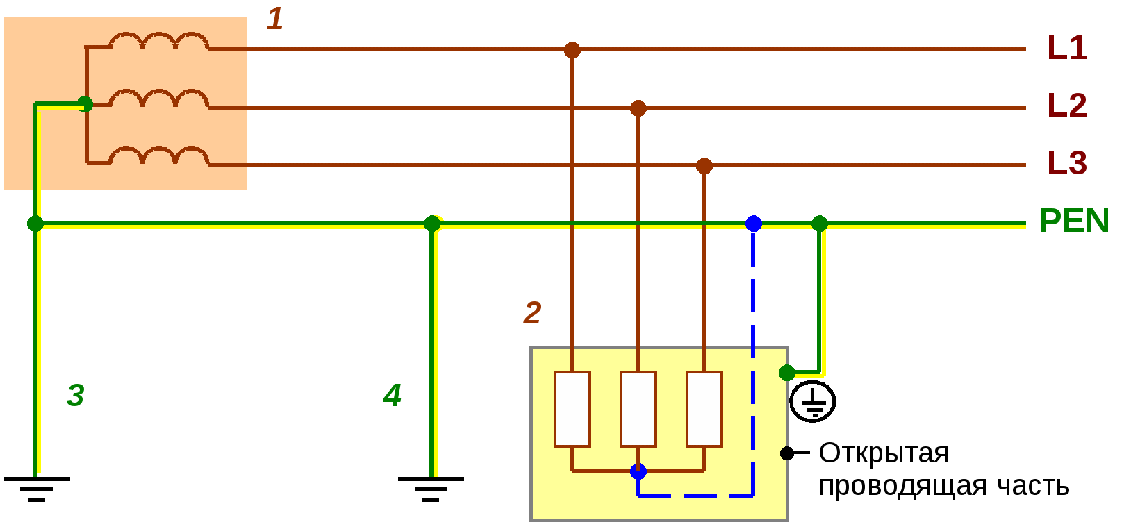 - TN-С — TN, где защитный (PE) и рабочий (N) нулевые провода совмещены в одном PEN-проводнике;