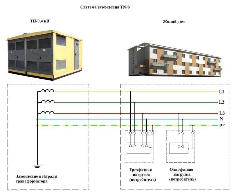 В современных многоквартирных домах используется система TN-S, в ней проводники N и PE разделены на всём протяжении от подстанции до потребителя. Эта система самая безопасная и предпочтительная, но применяется только в новых электроустановках из-за высокой стоимости. В большинстве домов сейчас используется система TN-C-S, в которой проводники N и PE после подстанции соединены в один провод PEN, а потом, на вводе в здание, разделены.