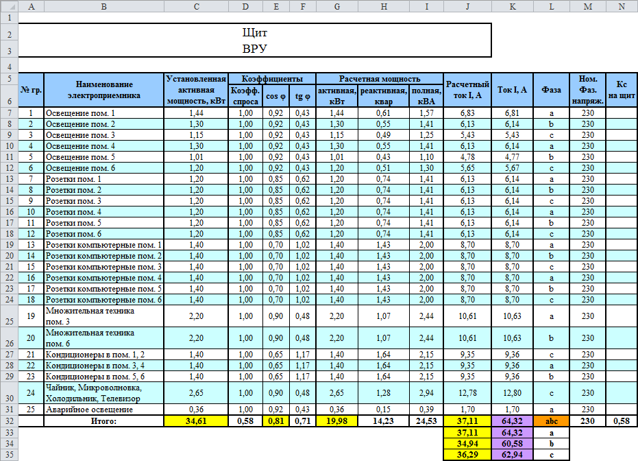 Вносим выбранные коэффициенты спроса для каждого типа нагрузки в столбик «Коэфф. спроса», столбик «D» в Excel. Получается, что мы устанавливаем коэффициенты спроса для групповой сети. Это неверно, но это промежуточный этап, в следующем шаге мы это откорректируем.