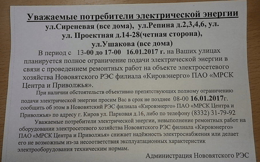 Периодически на энергосетях проводятся ремонтные работы, связанные с заменой устаревшего оборудования. Такого рода работы заранее планируются, поэтому потребитель извещается о времени отключения путём размещения на подъездах объявлений. В них указывается дата и время отключения и планируемое подключение.