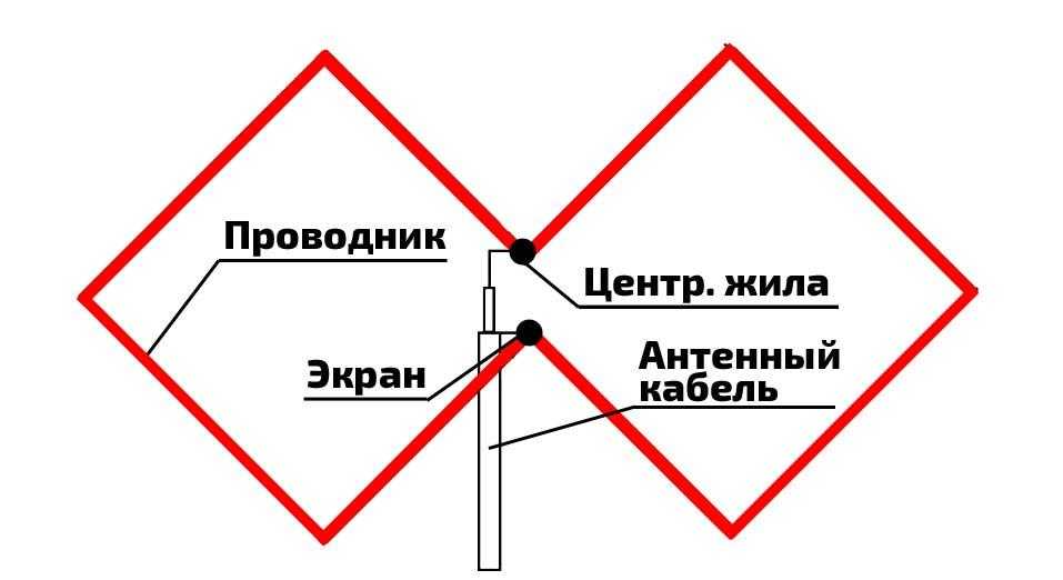 Чертёж готовой конструкции простой, поскольку состоит из двух ромбов, к которым крепится антенный кабель. Крепление находится на месте стыков ромбов на противоположных сторонах проволоки, поэтому путаницы не возникнет. Но желающим избежать ошибок мастерам стоит воспользоваться заранее припасённой бумагой: предварительно нарисовать схему. В результате останется согнуть проволоку в соответствии с чертежом, закрепив концы пайкой. Уверенные в собственных умениях личности могут обойтись без подготовительных процедур.