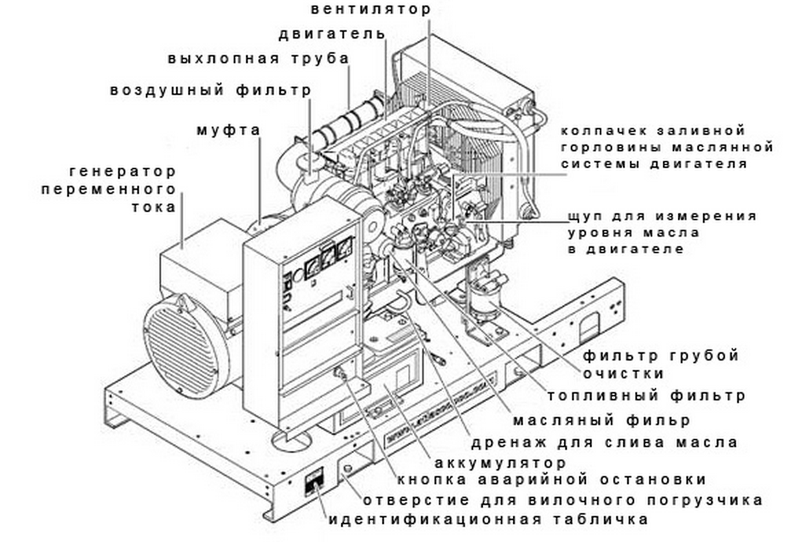 Дизельный двигатель генератора включает в себя шатунно-поршневую группу, состоящую из камер сгорания с расположенными в них поршнями и шатунами. Энергия воспламенения дизельного топлива передается через поршни и шатуны на коленчатый вал, обеспечивая его возвратно-поступательное движение и его передачу через муфту на вал электрогенератора.