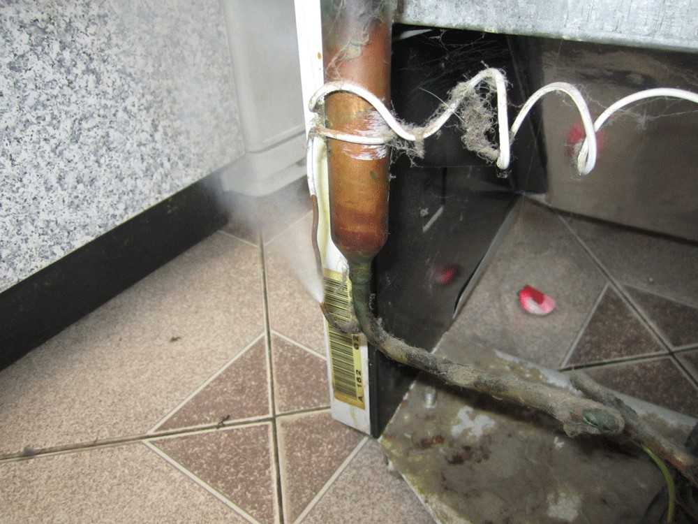 - Утечка фреона. В результате потери хладагента техника не сможет охлаждать внутреннее пространство. В капельных системах утечка может случиться из-за развития процесса коррозии, которая запущена попаданием талой воды на трубки. В холодильниках с системой «Ноу Фрост» могут выйти из строя места соединения трубок. При утечке фреона компрессор работает непрерывно и появляется наледь на задней стенке. В этом случае ремонтом также должны заниматься только специалисты.