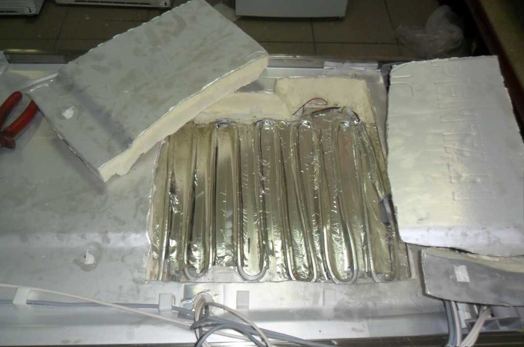 - Замерзание изоляции. Корпус охлаждающего шкафа укомплектован теплоизоляционным слоем. Если вы неправильно эксплуатируете технику или имеется заводской брак, в стенках может образовываться конденсат. Влажная термоизоляция промерзает и снаружи выступает лёд. Для устранения неисправности необходимо удалить повреждённый участок защитного слоя и заменить его на новый.