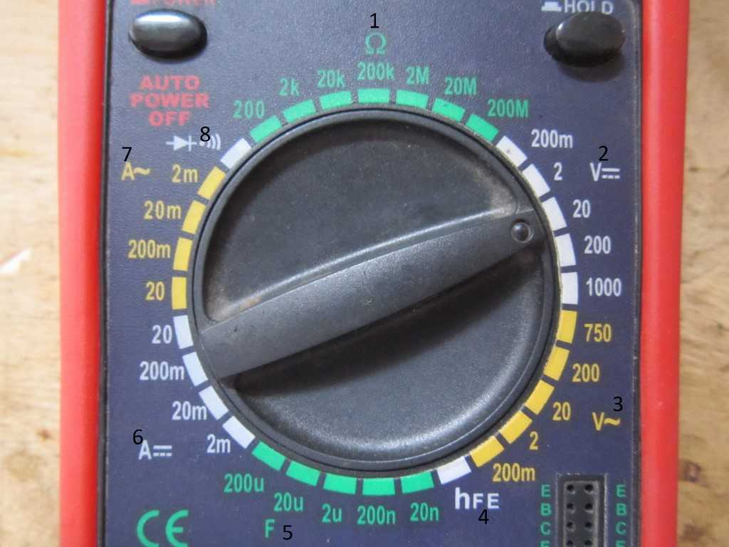 На лицевой части мы видим переключатель, с помощью которого можем выбрать нужные нам функции. Давайте разберемся с обозначениями, которые есть на мультиметре. Каждую функцию я пометил цифрой для удобства восприятия.