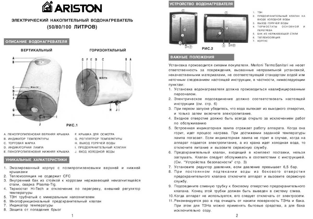 - вода обрабатывается в двух баках, в помещения с большой площадью рекомендуют водонагреватель Аристон этой модели в 100 литров.
