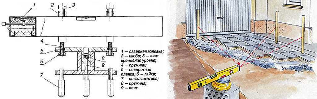 Но на поверку оказывается, что конечная точность разметки никуда не годится. А при пользовании «новым, хорошим» фирменным лазерным нивелиром всплывает еще одно обстоятельство: в процессе работы нередко требуется доюстировка прибора. Что практически сводит на нет сокращение трудозатрат. Попробуем разобраться, почему так и как поправить дело. Устройство лазерного уровня показано слева на рис. Там и видна его главная ахиллесова пята – начальная установка по трубчатому пузырьковому уровню. Для точной начальной установки луч прибора нужно выставить в горизонт по 2-м взаимно перпендикулярным плоскостям. Но на объекте, при постановке нивелира на случайную опору (справа на рис.), обе регулировки оказываются взаимозависимы! Подкрутил ножку штатива под горизонталь в одном направлении – по перпендикуляру луч «уехал» вверх или вниз. В итоге бывает проще отбить разметку руками, чем мучиться с настройкой лазера.