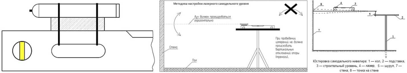 Хотя устройство самодельного лазерного уровня с лазерной указкой вместо специальной головки проще, но процедура его настройки (см. след. рис.) ничуть не менее трудоемка, а точность и стабильность оказываются гораздо хуже, чем при ручной разметке. В данном случав конструкцию добавляются еще 2 слабых места: головка-указка и узел вращения. Где гарантия, что луч указки «бьет» точно по ее оптической оси? Для того, чтобы просто водить лучиком туда-сюда, их аксиальности (соосности) не требуется, потому лазерные указки и дешевы. А если луч скошен, то при разметке по точкам вместо прямых горизонталей и отвесов получатся отрезки тангенсоид. Их прогиб на глаз может быть незаметен, но погрешность разметки за пределы допустимой выйдет.