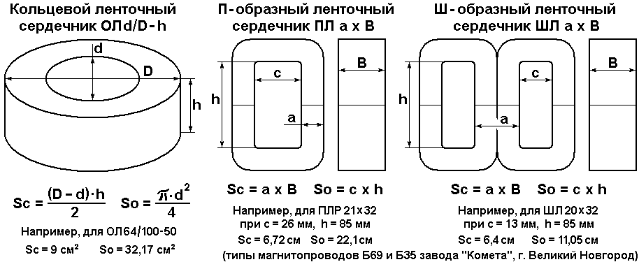 При использовании отдельных пластин для сборки вначале по мощности трансформатора определяют толщину его пакета и, соответственно, нужное число Ш-образных или О-образных листов (по справочнику). Затем их поочередно вставляют в отверстие на гильзе катушки и стягивают шпильками и гайками (в пластинах есть для этого специальные отверстия).
