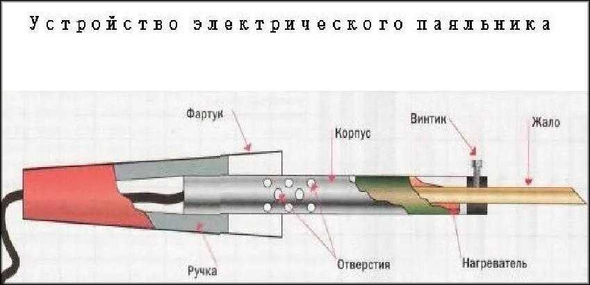Обычный электропаяльник включает: нагревательный элемент для паяльника, жало, корпус, защитный фартук, ручку, подводящий провод. Все перечисленные элементы могут быть сделаны своими руками или выбраны из готовых элементов от других, например неисправных приборов.