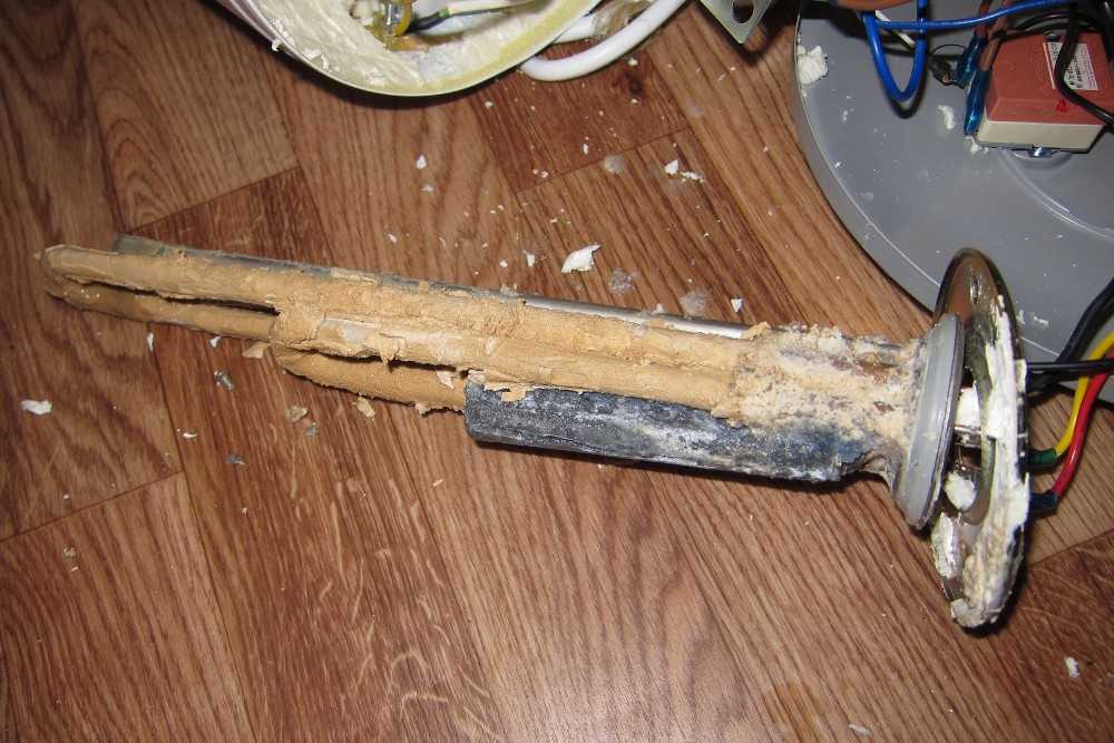 Известковые отложения образуются на греющем элементе из-за того, что неисправен анод — магниевый стержень, ответственный за уничтожение и предотвращения образования накипи.