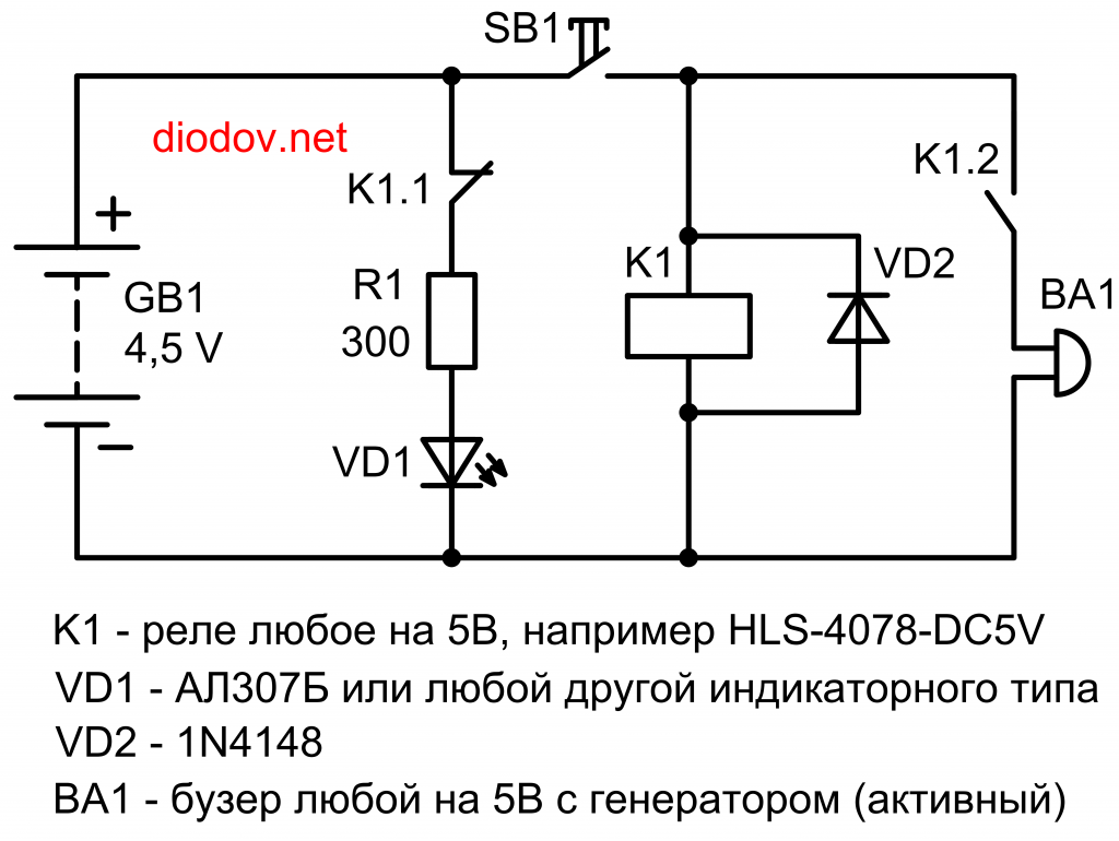 При нажатии кнопки SB1 ее контакты замыкаются, и создается путь для протекания тока через катушку K1. Когда реле получило питание ее нормально замкнутые контакты K1.1 размыкаются, а нормально замкнутые контакты K1.2 замыкаются. В результате гаснет светодиод VD1 и раздается звук бузера BA1.