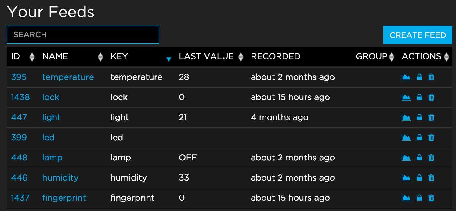 Теперь приступаем к тестированию! Перейдите в меню пользователя вашего Adafruit IO, в меню Feeds. Проверьте, созданы или нет каналы для отпечатка пальцев и замка (на принт-скрине ниже это строки fingerprint и lock):