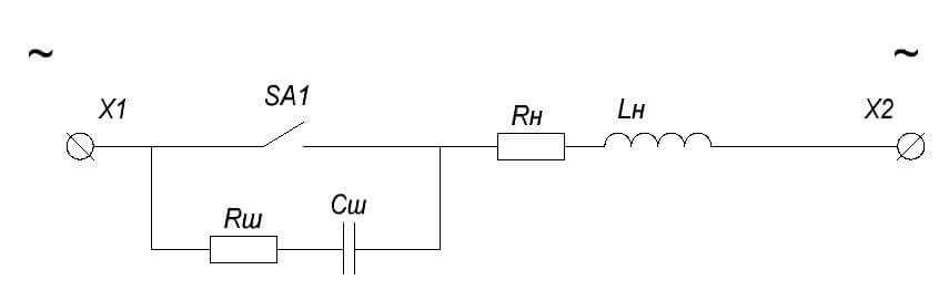 А если искрят контакты в цепи переменного тока, можно установить искрогасительную RC цепь, её иногда называют шунтирующей, а в электронике – снабберной. Она выполняет роль защиты за счёт того, что энергия, накопленная в индуктивностях, стремится рассеяться не на коммутационном аппарате, а на активном сопротивлении этой цепи.