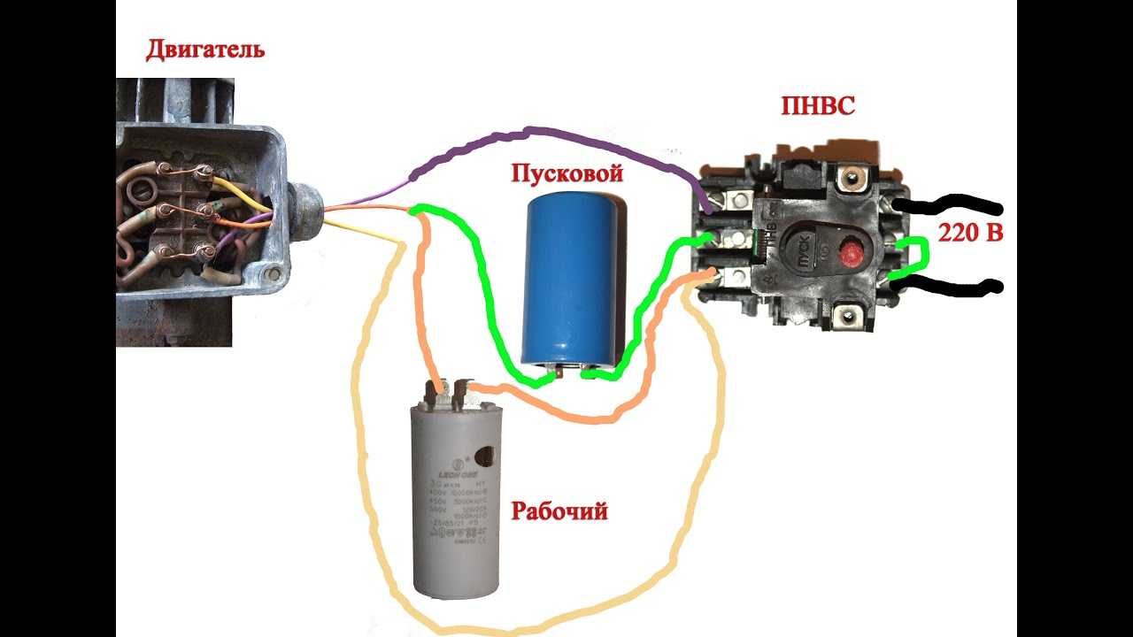 - схема подключения однофазного двигателя с использованием пускового конденсатора;