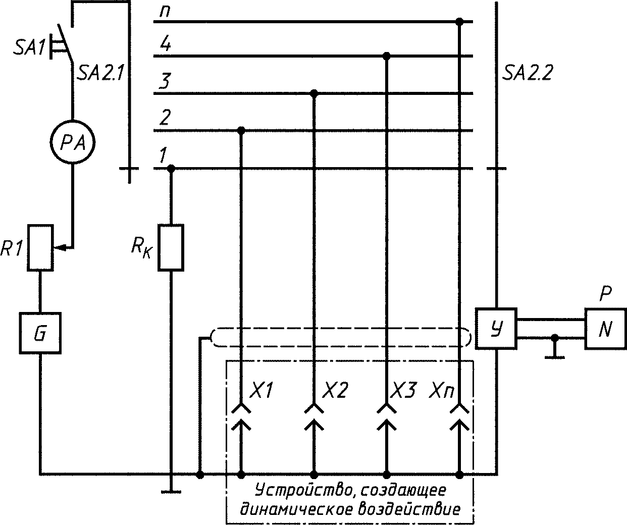 G — источник тока; SA1, SA2— переключатели; РА — амперметр; R1 — переменный резистор; Rk — калибровочный резистор; У — усилитель; Р осциллограф; XI, Х2, ХЗ, . . . , Хп — измеряемые контакты: 1, 2, 3, 4, . . . , п — положения измеряемых контактов