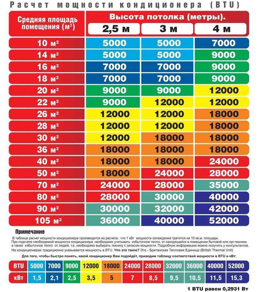 Рассчитав мощности теплопритоков от бытовых приборов, взяв во внимание размеры помещения, получим число 3,65 киловатт. Следовательно, кондиционер должен быть мощностью от 3,15 до 3,80 кВт.Многие пользователи не хотят рисковать, самостоятельно высчитывая параметры мощности. Даже при самом тщательном отношении к делу, можно допустить ошибку и приобрести маломощный или, наоборот, очень мощный кондиционер
