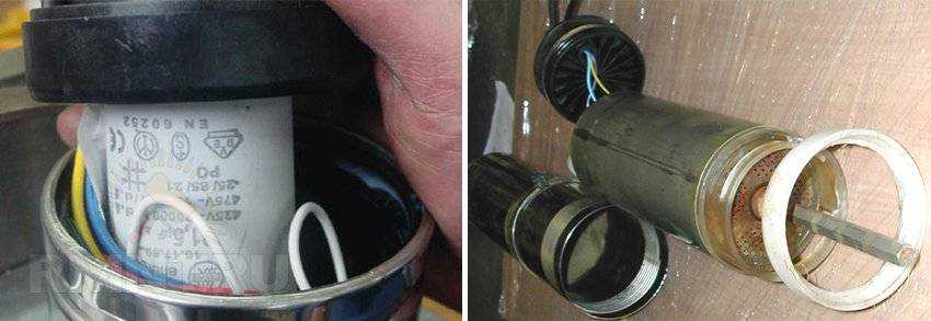 В насосах монолитной конструкции двигатель нужно выдавить из стакана, нажав на отвод подключения отходящего трубопровода при снятых крыльчатках. В штоковых насосах моторная часть отсоединяется при расстыковке двух половин, в шнековых — после снятия рабочего винта. Во всех случаях к внутренностям двигателя (конденсатору, соединительным клеммам) можно добраться только после снятия герметичной пробки. Она фиксируется 2-3 винтами на боковой поверхности гильзы и мощным стопорным кольцом. В некоторых разновидностях насоса пробка может требовать применения специального съёмника.
