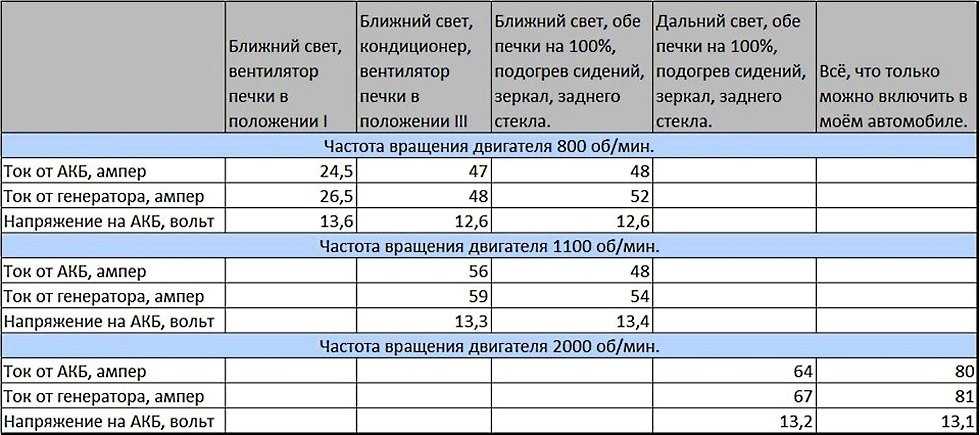 Потом включаем дальний свет фар, печку, аварийную сигнализацию и другие приборы и опять замеряем напряжение на генераторе. Оно понизится под нагрузкой включенных приборов, но значение напряжения в этом случае не должно быть ниже 13,2 вольта. Если оно ниже минимального — «недозаряд».