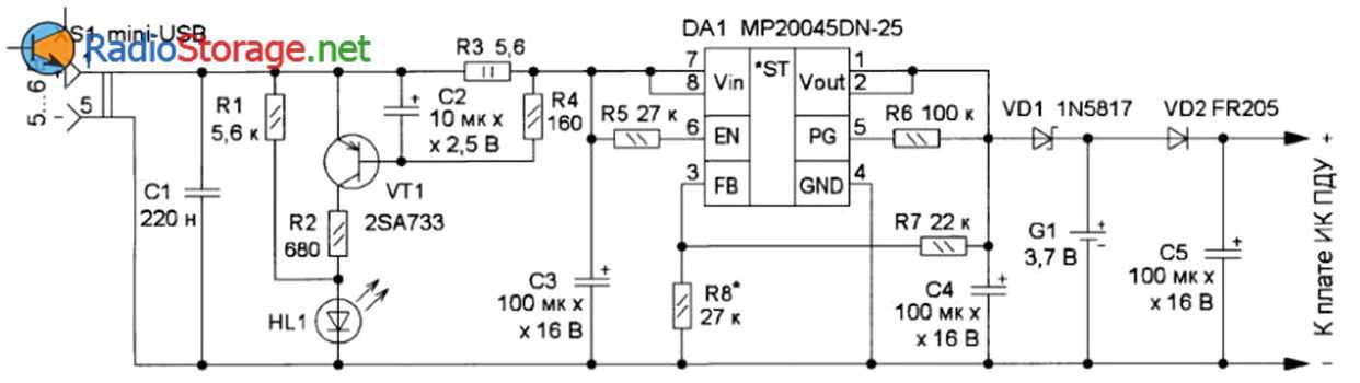 жение постоянного тока 5…6 В поступает на гнездо XS1 (mini-USB). Резистор R3 ограничивает зарядный ток. Если аккумулятор G1 заряжен не полностью, транзистор VT1 открыт, светодиод HL1 светит ярко.