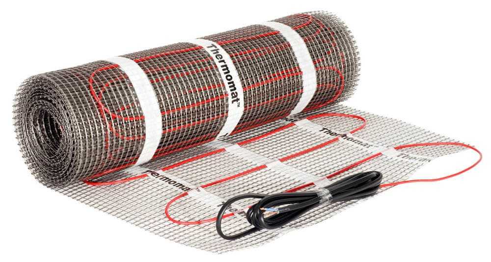 Нагревательные маты – это тот же резистивный кабель, но имеющий армирующую основу в виде сетки. При этом провод зафиксирован определенным шагом. Длина матов может быть разная, а ширина чаще всего составляет 45 сантиметров.
