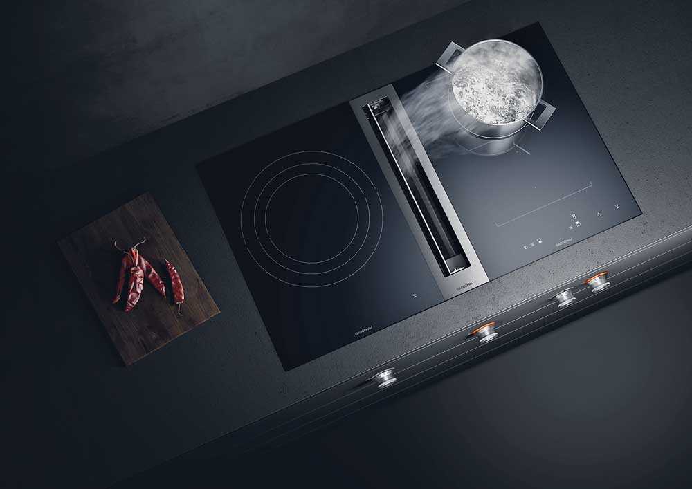 Индукционные варочные панели Gaggenau со встроенной вытяжной системой и панелью управления Twist-Pad со съёмным магнитным переключателем. Фото: Gaggenau