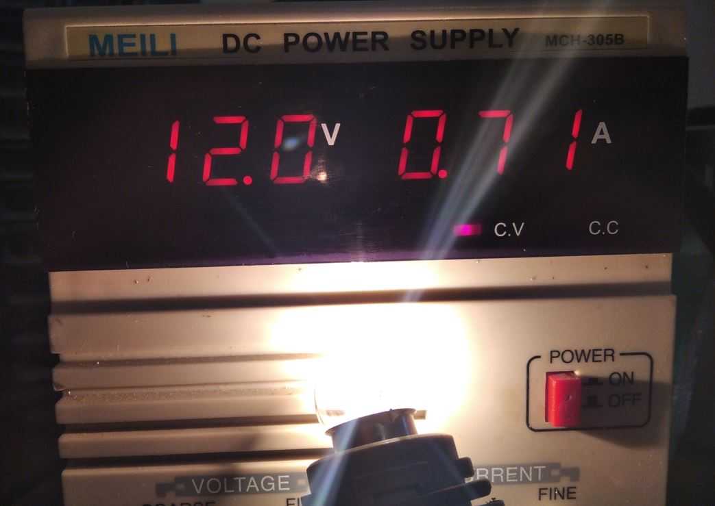 Давайте же узнаем это на опыте. У меня есть лабораторный блок питания, который показывает сразу напряжение и силу тока, которая течет через нагрузку. Беру лампу, выставляю на блоке питания напряжение, которое написано на самой лампе и подключаю ее к клеммам блока питания.